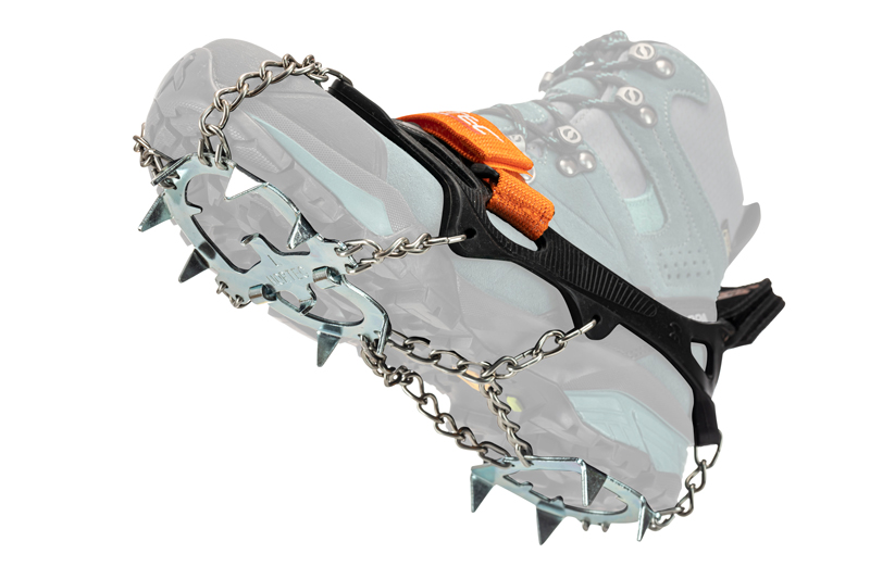 • 8 gehärtete Stahlspitzen für sicheren Halt auf eisigen und rutschigen Untergründen.